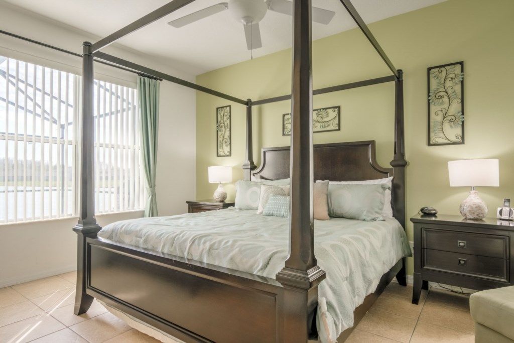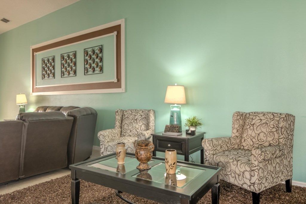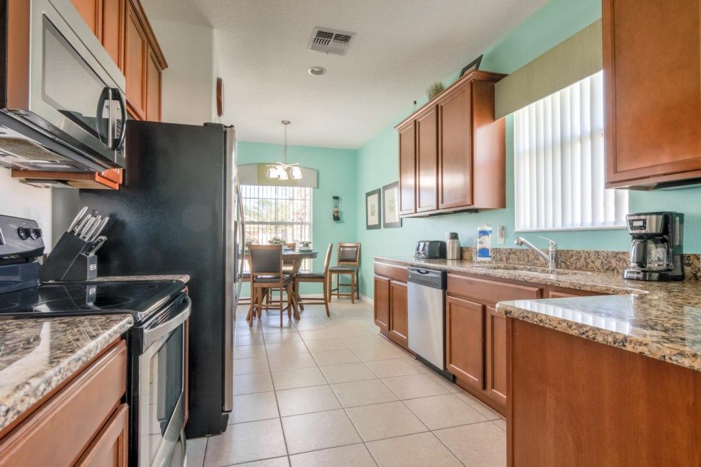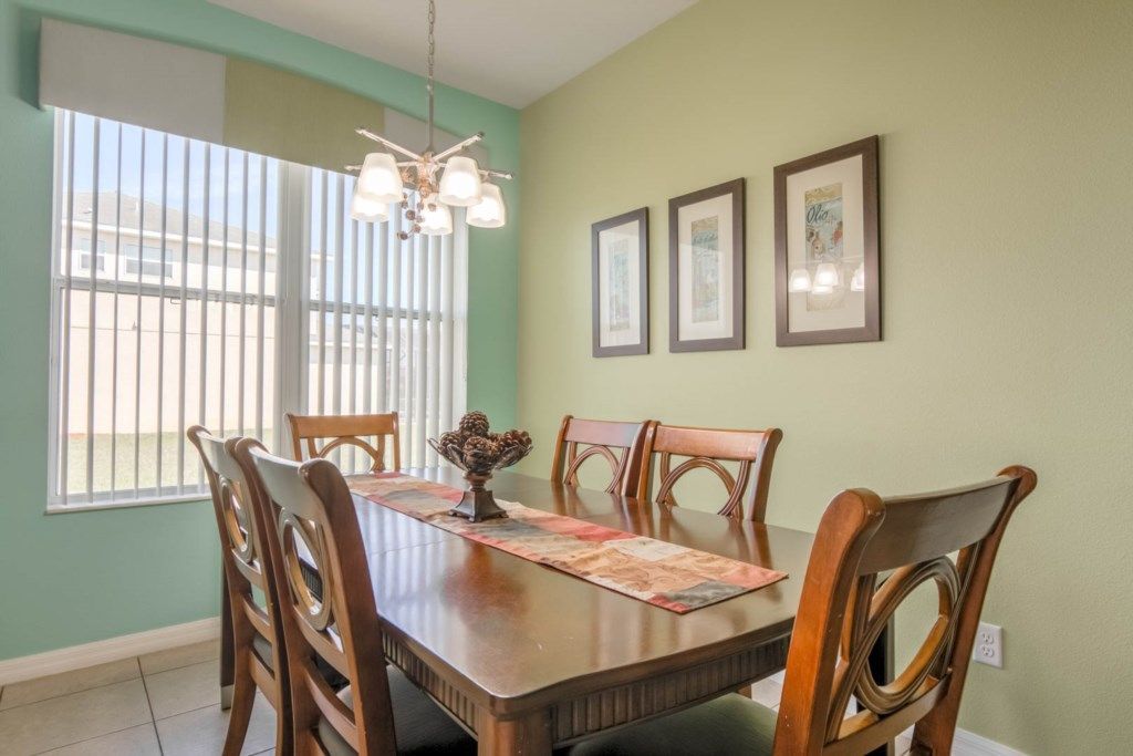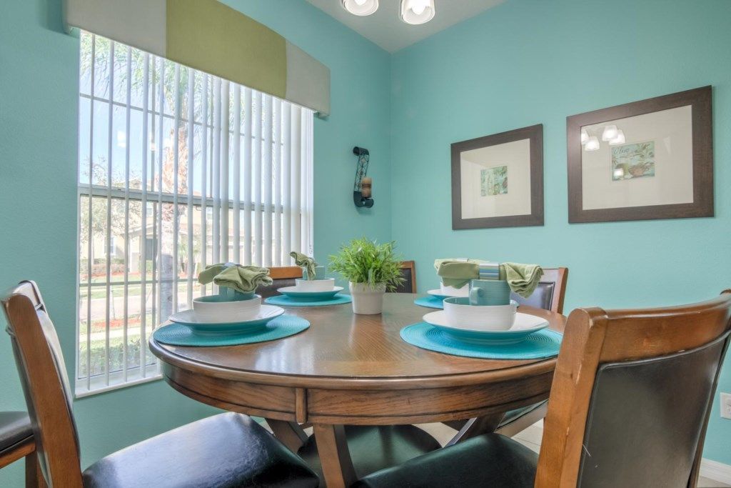 As you pull up to this villa, you’ll immediately notice the well-manicured front yard, and your eyes will be drawn to the yellow stucco and brick building in front of you. Let’s start with the living room. It’s large! It has a large brown leather sectional with reclining seats, a large flat screen TV, and a teal-color accent wall that makes everything in the room really pop. This is really a great place where you can lounge in a recliner and watch a good movie after a long day out at the parks. The patio door at the back of the living area joins the room to the pool area (we’ll talk about this a little later on). There’s also another small sitting area just behind the living room with two armchairs. This is the perfect place to sit down and have a conversation with someone. Not in the mood to eat out? Dine in! This villa has a great galley-style, fully-equipped kitchen with granite countertops, stainless steel appliances, and plenty of workspace. There are two dining areas: the formal dining room and the breakfast nook. The breakfast nook has a round wooden table with seating for four, and the formal dining area has an ornate wooden dining suite with seating for up to six people.
