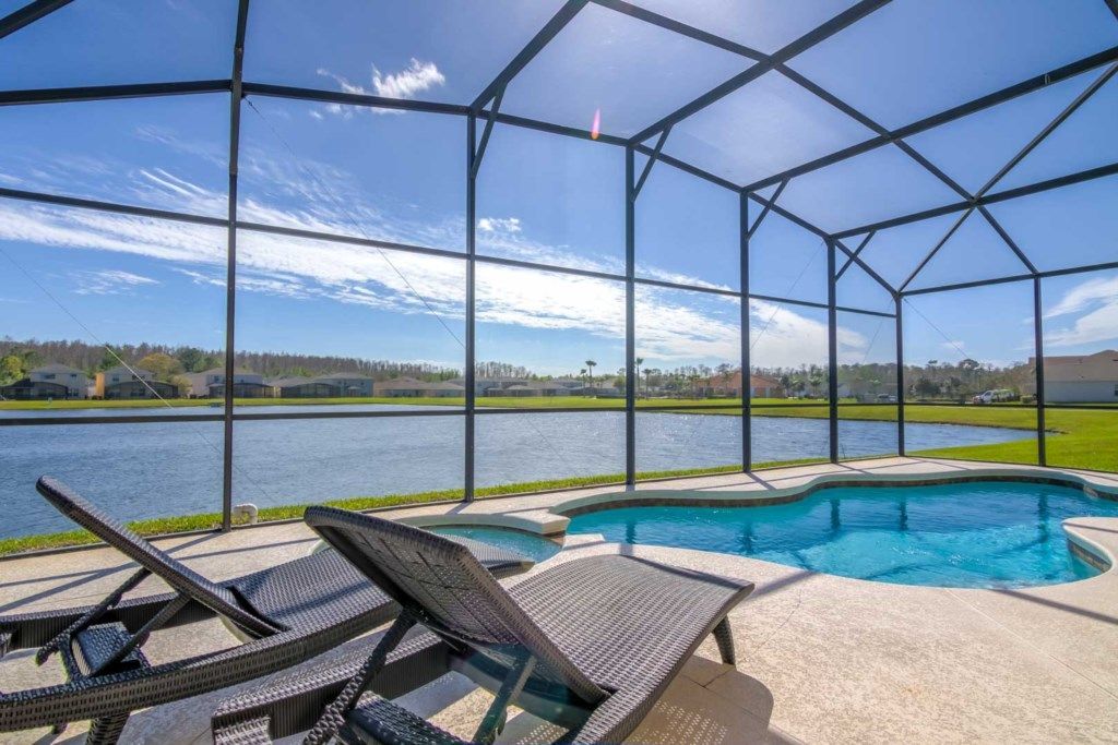 Now, for the pool! This has to be the best part of the villa. The pool area is screened in has a great view of the lake behind it. If you want to cool off after a long day out, take a dip in the lagoon-shaped pool. If you want to work on your tan, lay on one of the sun loungers. If you want to get out of the sun for a bit but remain outside, sit under the covered lanai.